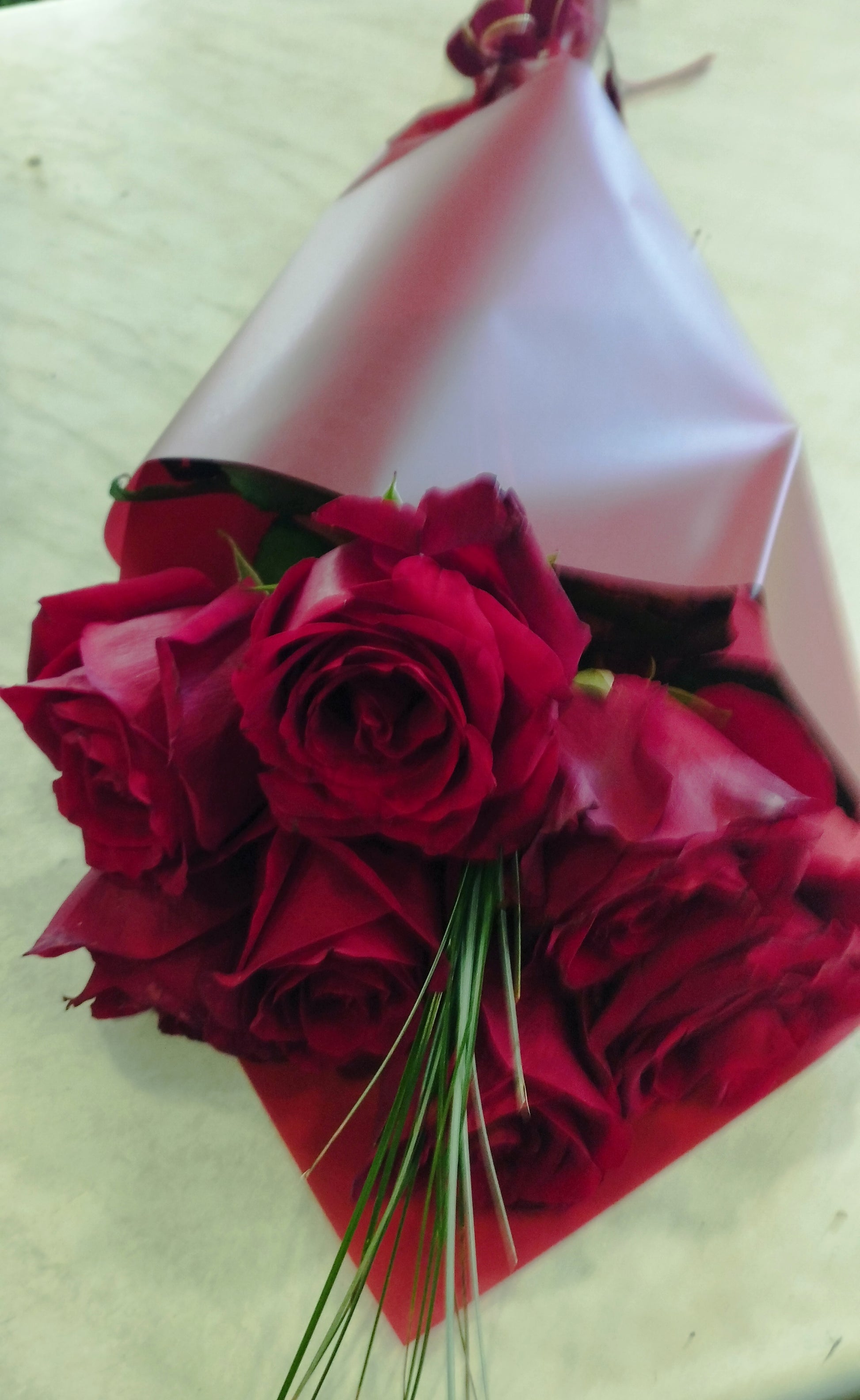 Öt száll bordó rózsa tölcsérben masnival