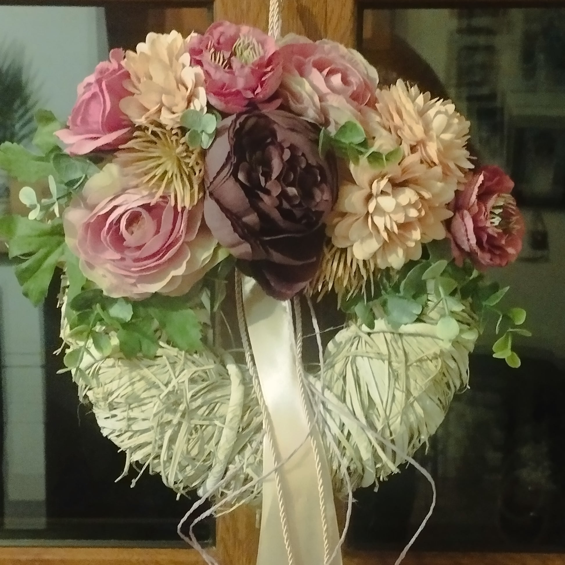 Fehér vessző alapon rózsaszín és mély bordó koszorú
