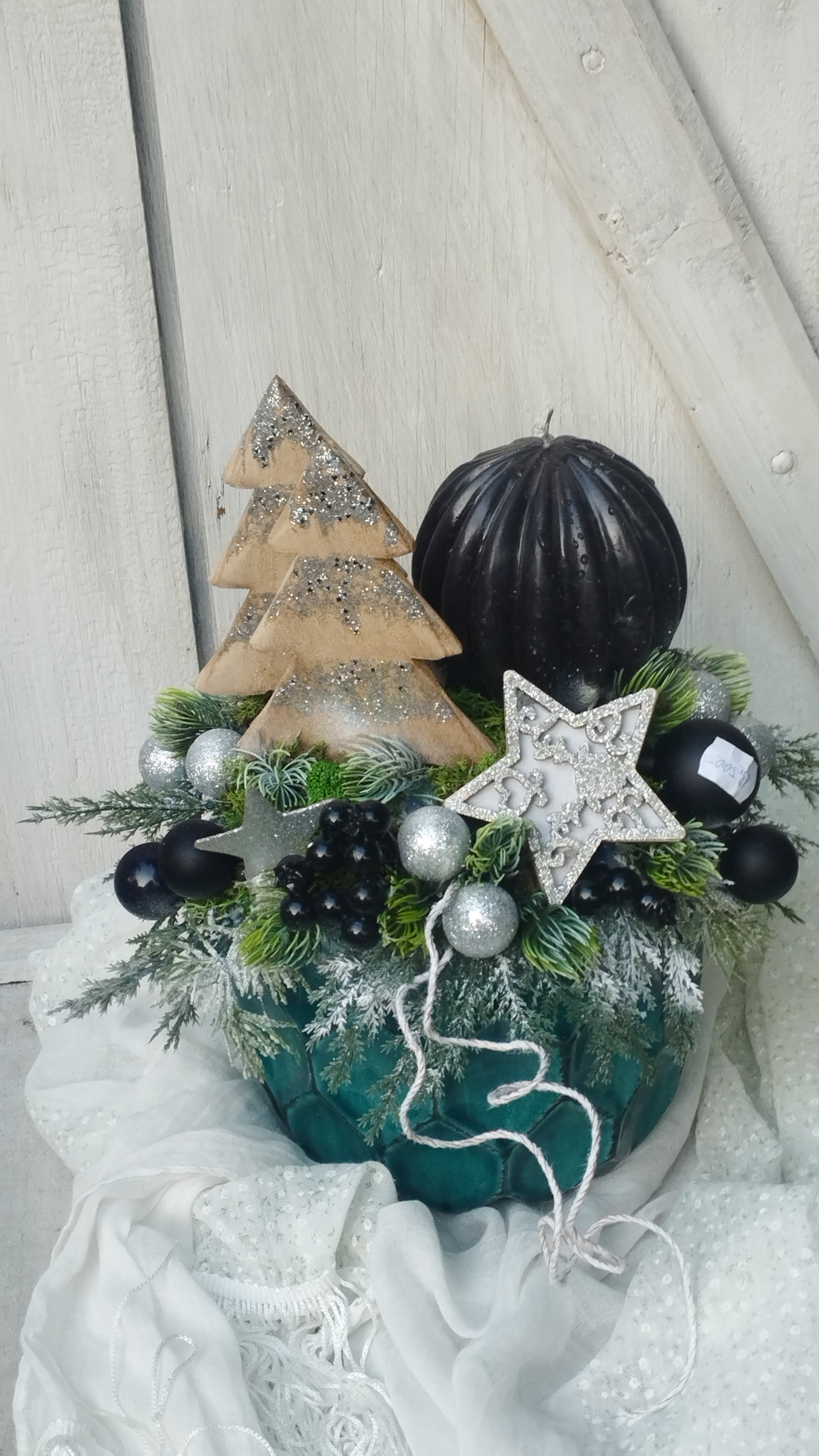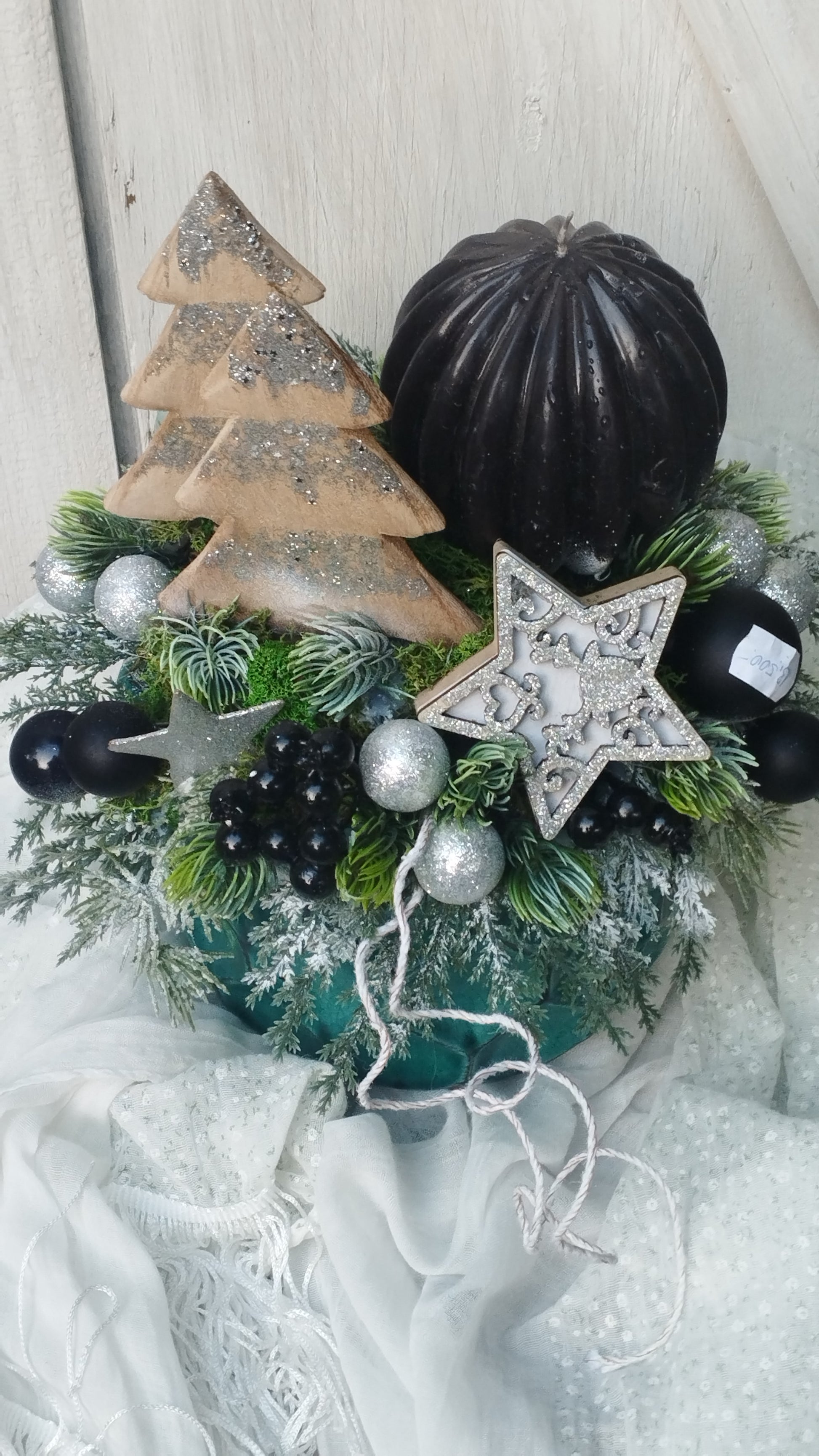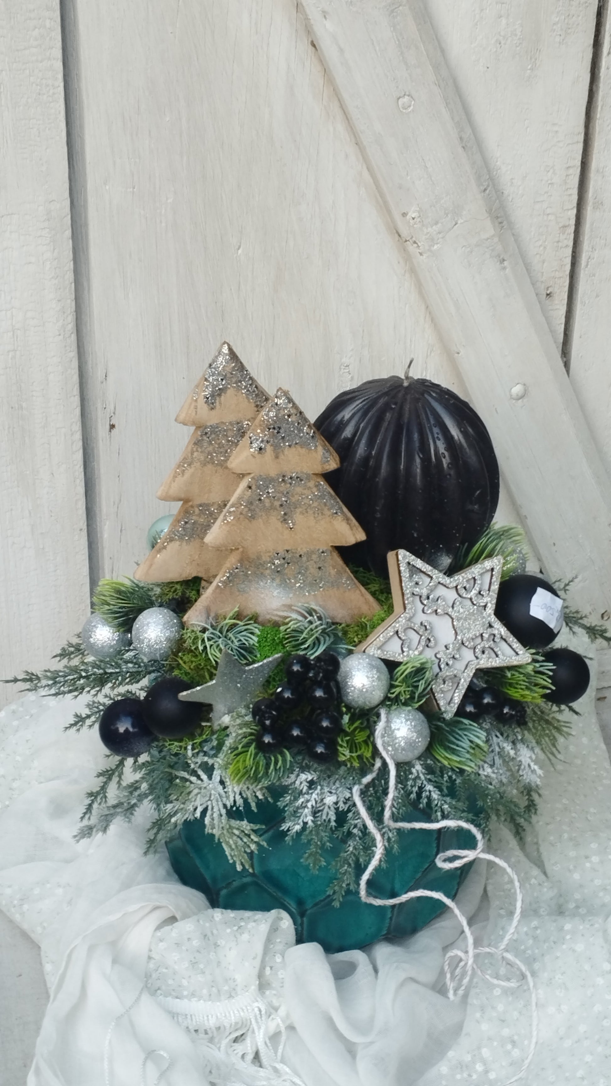 Zöl kaspóban fa fenyők , ezüst és fekete díszítéssel