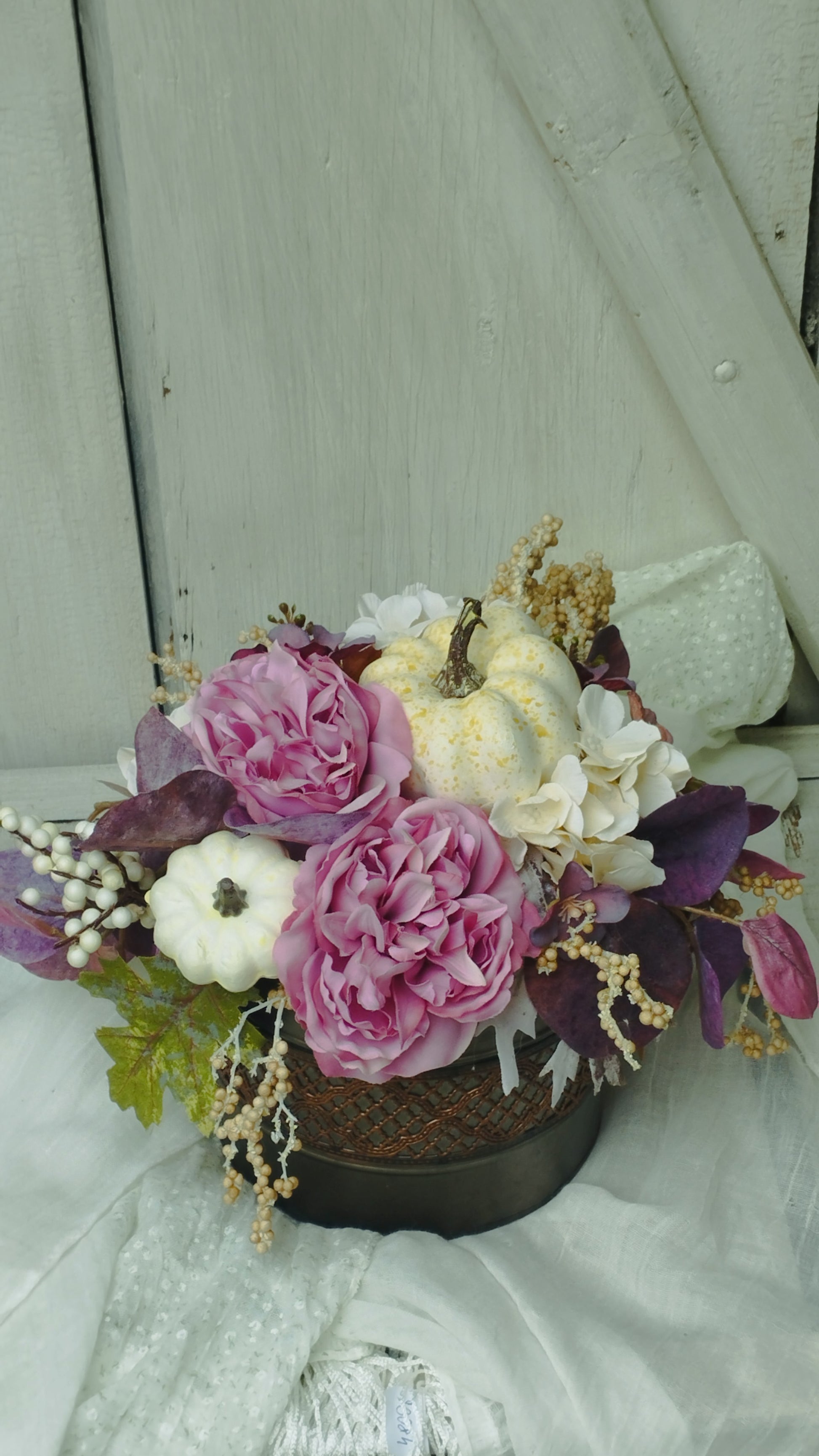 Ciklámen színű virágok pasztell tökkel , réz vödörben